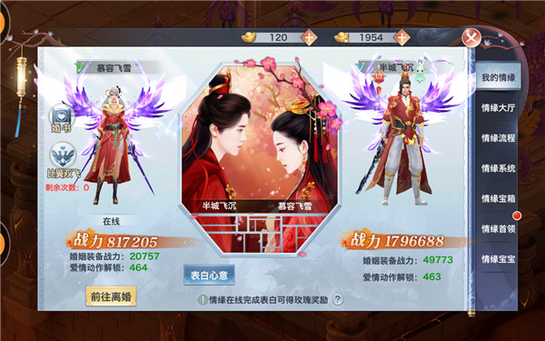 婚后生活:情缘装备升级,共同挑战情缘首领,培养情缘宝宝,提升战力。