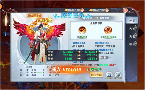 属性的提高:完成了每一阶段的转职任务后,角色都能够获得攻击、生命、防御基础三维属性的巨幅提升。