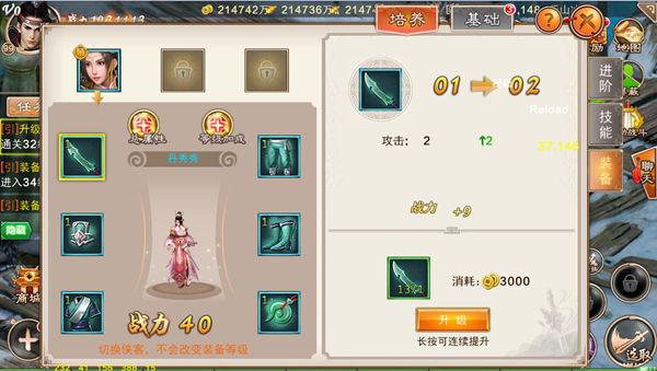 侠客装备系统为侠客提供额外战力,装备可升级随着侠客等级的提升。