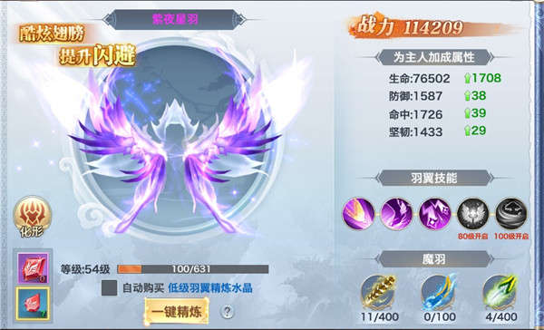 4)羽翼化形:玩家可以通过获得特定的羽翼精魄来激活不同款式的羽翼皮肤,增强角色的闪避几率。