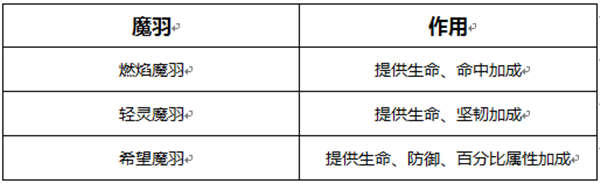 魔羽:这是一种资质丹类型的道具,包括轻灵魔羽、希望魔羽、燃焰魔羽,每种魔羽提供的属性加成各不相同。