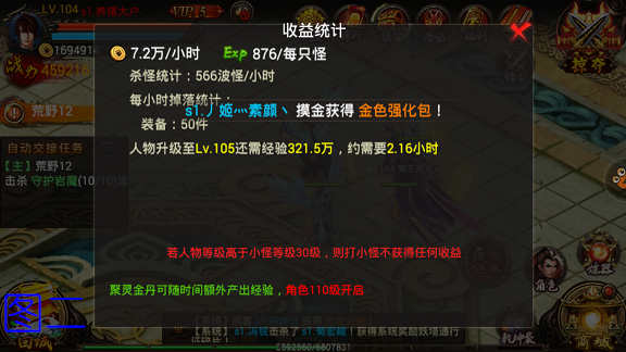 从“图一”可知小编104圌级正在打124圌级的怪物。大家是不是很茫然?这和小编说的注意事项似乎有些矛盾。别想太多,这只是小编在为大家证明小编所言非虚!小编此时的输出确实能秒杀这124圌级的怪物,而且比打低级怪物所获得的每只怪物经验也高了一些。但是小编此时获得的装备少了很多!“图二”是自带的收益统计功能。从“图二”中看出小编打124圌级怪物每小时掉落50件装备,打566波怪物。那么问题来了,这收益有何问题?小编要告诉大家小编我104圌级在做这个实验之前打的是103级怪物。每只怪物709经验,小时杀怪701波,每小时掉落94件装备。接下来请看小编用数据说话:
