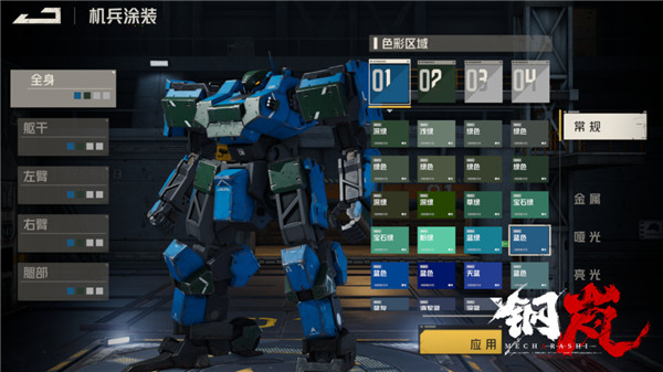 施密特色彩的最新第三版色彩标准分为四大系列:常规、金属、哑光、亮光。不同的机兵制造商和武装组织对这些系列有不同的偏好,施密特色彩提供全方位服务。