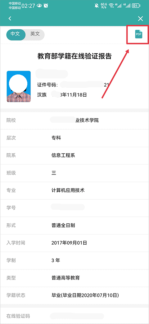 6、在学籍在线验证报告中点击pdf图标,下载打印学籍信息查询报告。