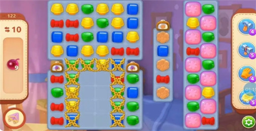 通过图片,可发现本关被分为三个区域,左边是被铁链分割成两边的可自由消除区域,中间为饼干生产机,右边是被果冻包裹的收集目标樱桃区,因为果冻的排列位置,无法在果冻区匹配元素收集樱桃,所以要好好利用道具去收集果冻,本关只有10步,需要谨慎走每一步。(樱桃和果冻:樱桃都被果冻包裹起来,果冻里能直接看到樱桃的只需在其旁边匹配一次元素或者使用一次道具即可收集樱桃,果冻上面有一圈图案的则需两次才可以收集樱桃,果冻上面有一朵花的则需三次才可以收集樱桃