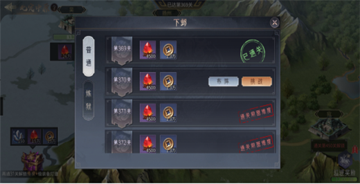 在征战通关3-9之后开启北定中原的系统,在北定中原中,每个城池章节下有分为普通关卡和炼狱关卡,只有通过上一普通关卡才可以挑战下一普通关卡。完成该章节所有普通关卡后,即可挑战炼狱难度的关卡,布阵好相关阵容并挑战其中的关卡,挑战胜利可以获得装备打造石、铜币资源。