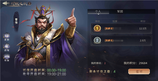讨贼之战活动分为2个阶段:讨伐、抢夺,每日00:00开启讨贼之战讨伐阶段,消耗次数讨伐首领可获得积分,根据讨伐首领造成的伤害,每次可获得一定的积分,当日19:00结束讨伐阶段,同时开启抢夺阶段,可消耗次数抢夺其他军团玩家的积分,抢夺时,每击败对方1位武将,可获得对方当前积分的2%,当日21:00抢夺阶段结束,结束后,根据本次活动积分进行排名,每个参与活动的玩家根据个人积分牌名与军团积分排名发放奖励;