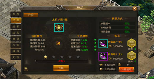点击主界面的神炉系统图标,进入护盾界面:护盾分为12级,等级越高的护盾能够提供给角色更高的物理和魔法防御加成。 低等级的护盾可通过消耗护盾碎片进行升级,进阶为更高等级的护盾。拥有高等级护盾,再也不担心被别人一刀秒杀了。