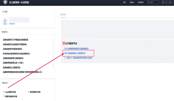 ◆ 浏览器打开“https://ysjy.ynjy.cn/ynedusso/#/homePage”,使用“云南教育云app手机版”APP的“扫一扫”功能登录“云上教育统一认证系统”,进入后选择“公共服务平台”下的“云南省教育人才遴选平台”。