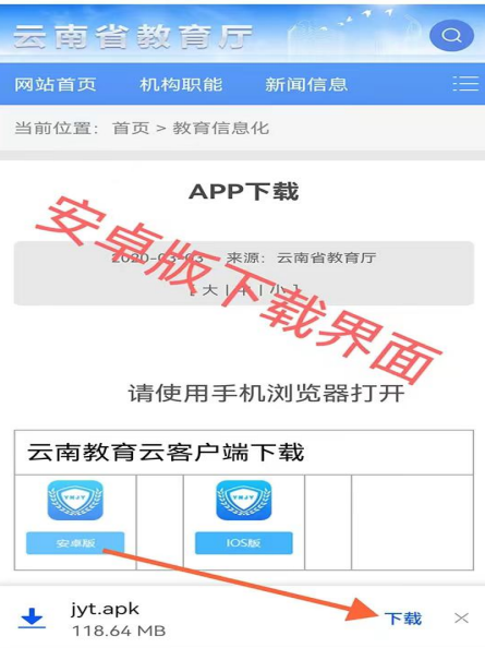 ◆ 在手机浏览器打开网址“app.ynjy.cn”下载“云南教育”,提供安卓和iOS版本。