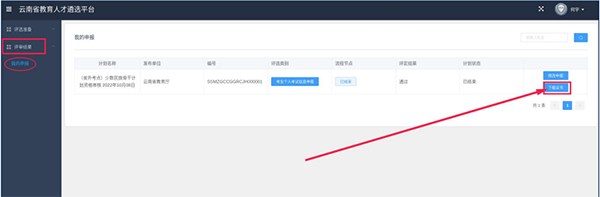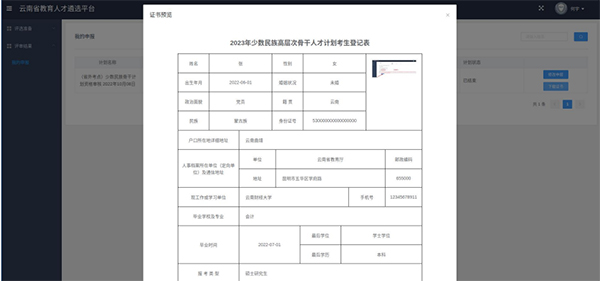 ◆ 在云南教育云app手机版“评审结果”下的“我的申报”中点击“下载证书”,下载“2023年少数民族高层次骨干人才计划考生登记表”。