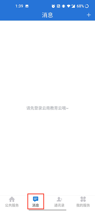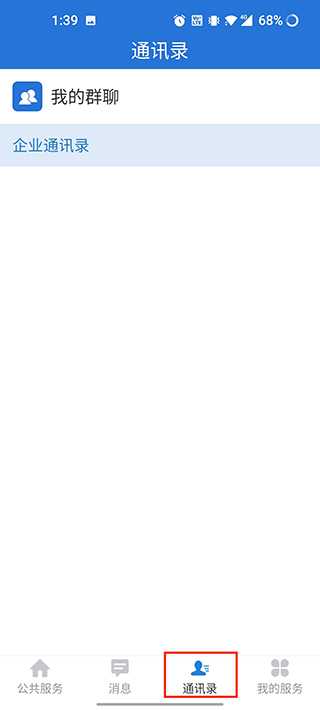 2、阅读并同意后,进入应用界面,分为公共服务、消息、通讯录和我的服务四个部分。