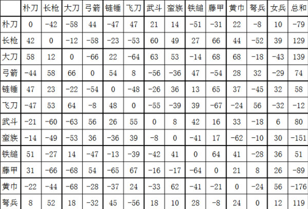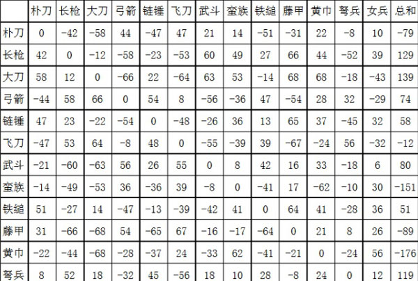 兵种相克表: 以朴刀、武斗、藤甲为代表的短兵器;以长枪、大刀、 铁锤为代表的长兵器;