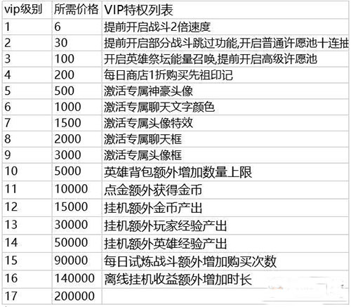 - 游戏初期,金币、英雄经验、进阶徽章可能会短缺。但过了开区的前10天,经验和徽章不再是问题。金币在游戏中用途广泛,用得恰到好处很关键。下图是VIP金额表,供参考。游戏中可直接在头像下查看VIP特权。