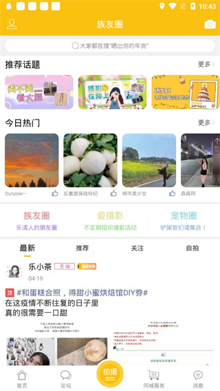 在族友圈发布个人动态,同时查看其他用户发布的各类动态。
