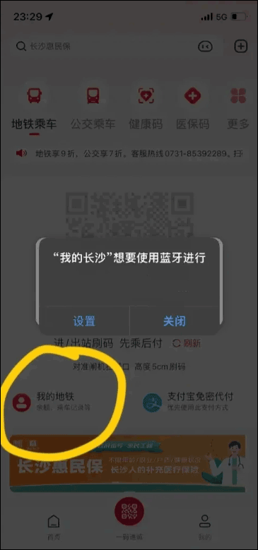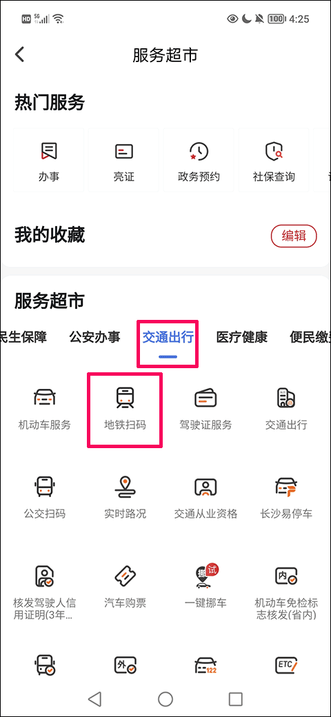 2、在“服务超市”中的交通出行栏目找到并点击“地铁扫码”;