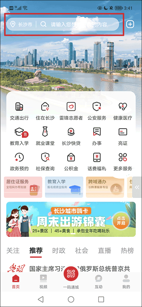 1、在我的长沙地铁app首页的搜索栏输入“居住证”;