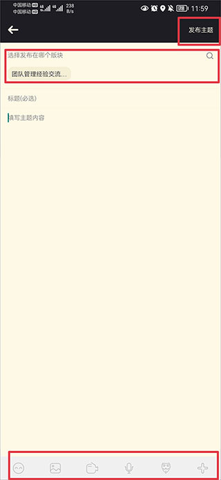 - 在编辑界面搜索并选择版块,编辑发布内容和标题,完成后点击右上角发布。
