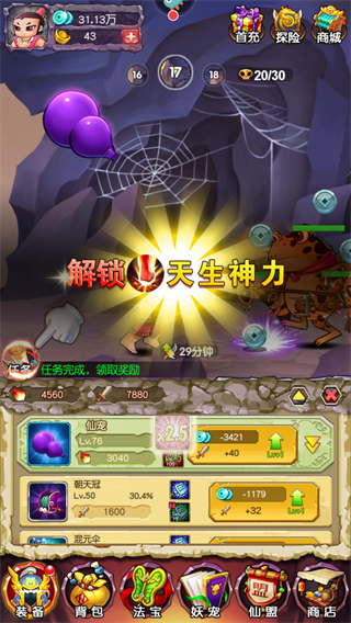 3、这时,仙洞功能便显得尤为重要。游戏共有三种仙洞:金银仙洞、镀金仙洞、灵石仙洞,分别提供银币加成、镀金守护加成和原石加成。仙洞的产出依赖于妖宠的驻守,妖宠等级和品质越高,产出越丰富。仙洞还可升级以获取更多资源,这对提升战力和闯关极为有利。