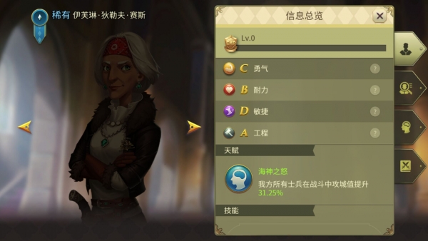 对于尚未拥有攻城器械的玩家来说,伊芙琳·狄勒夫·赛斯是一个宝贵的资产。她能显著提高士兵的攻城效率,使玩家能够更容易摧毁敌方城堡。她的工程属性评级为A,有助于增强军团士兵的攻城伤害和防御设施的耐久度。伊芙琳特别适用于攻城战和防御战。