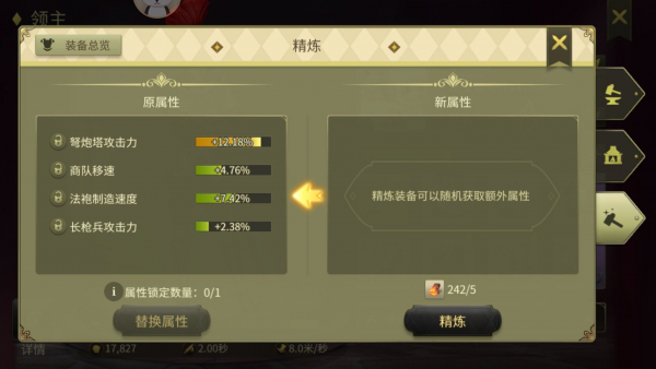 装备可以为领主带来多种属性加成,包括军团攻击力和生命力等基础属性。佩剑、手甲、头盔和鞋子主要提供攻击力加成,而肩甲、裤子、上衣和勋章则是生命力加成。通过精炼装备,玩家可以获得期望的属性加成,这些加成可以与玩家的派系相结合,进一步加速领地的发展。