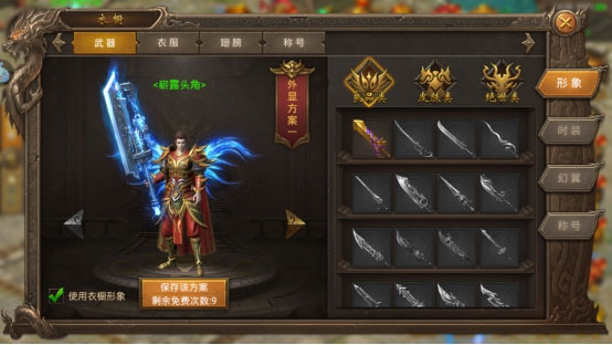 在角色形象搭配中,玩家可以选择不同的部位进行个性化装扮,包括武器、衣服、翅膀和称号。