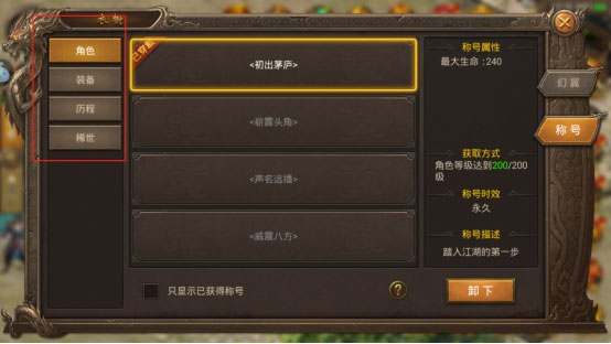 游戏内的称号分为角色、装备、历练、稀世四种,且分为三类:永久类、动态类和限时类。永久类称号的属性效果永久有效,动态类称号只在特定条件下有效,限时类称号则会在倒计时结束后失效,相关属性加成也随之消失。