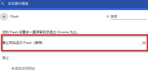 6、关闭“禁止网站运行Flash”选项以启用Flash。