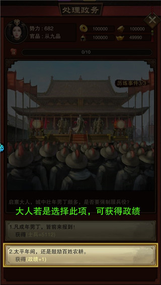 7、需要处理政务,玩家需要按照题目来选择不同选项;比如,城中壮年男丁颇多,是否要强制服兵役,可以选择两种不同的选项,所获得的经验也不同;