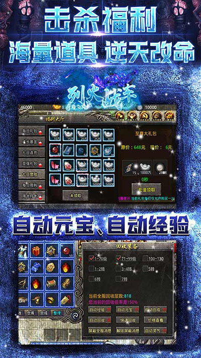 1. 至尊大礼包一折购买,每日可享受折扣购物。2. 击杀怪物领取海量道具,改变游戏命运。