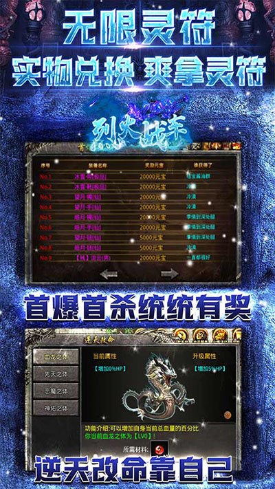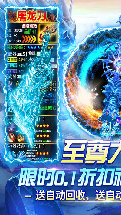烈火战车传奇手游0.1折版是一款提供极为丰富福利的传奇风格手游,为玩家带来了真正的超值体验。游戏设有无限爆率的灵符和独家至尊大礼包,一折价格让玩家享受前所未有的优惠。游戏包括了多人BOSS夺宝、血战沙城PK等经典场景,玩家在击杀怪物时可获得丰富的道具,无任何绑定限制,自由交易。游戏上线即赠送自动挂机、自动拾取、自动分解等便捷功能,所有装备和材料均靠灵符和装备爆出。