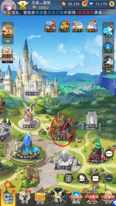 1、首先,进入手游,在游戏界面中找到并点击“装备工坊”;
