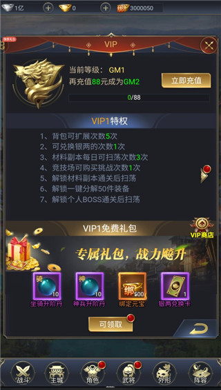 2、之后就是福利相送了,玩家们可以轻松领取满v身份和海量元宝