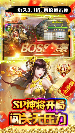【放置挂机,轻松养成不肝不氪】还原经典剧情融合放置挂机,每日挂机收益、英雄一键进阶升级,趣味养成轻松提升战力。