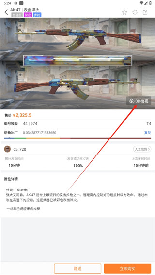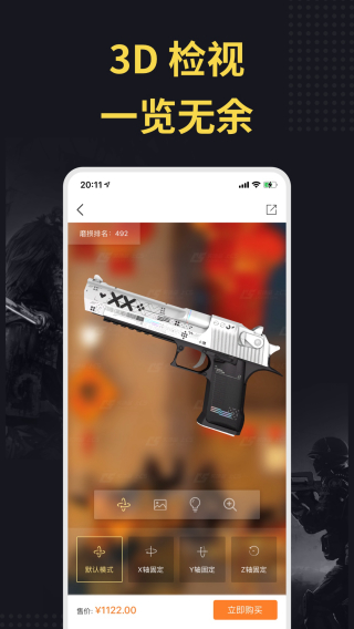 c5game是一款非常专业的CSGO游戏饰品交易平台。旨在为CSGO游戏爱好者提供一个安全、实惠的交易服务。这里拥有着海量的CSGO武器饰品,其中有刀具、枪械、手套、贴纸等多种不同的饰品,满足不同用户的需求。点击进入可以查看视频的属性详情,编号模板,价格等信息,并且软件还支持3D检视服务,你可以360度无死角的查看饰品的每一个谢姐,帮助玩家选择是否购买该饰品。