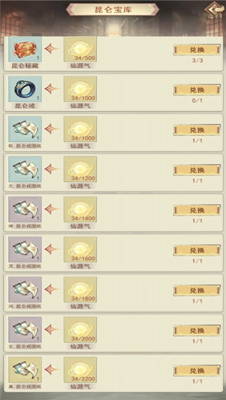 仙源气用途有三,一是兑换昆仑戒及其升级图纸,二是兑换昆仑秘藏,三是升级秘术进度。