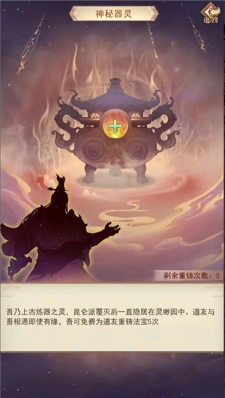 在此处可为法宝和装备进行免费的器纹重铸,重铸次数不定,5次起步,次数多少看个人运气,其内画面如下图
