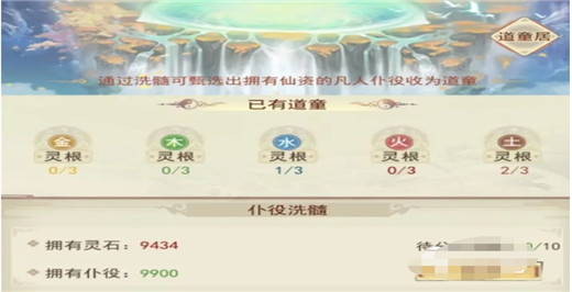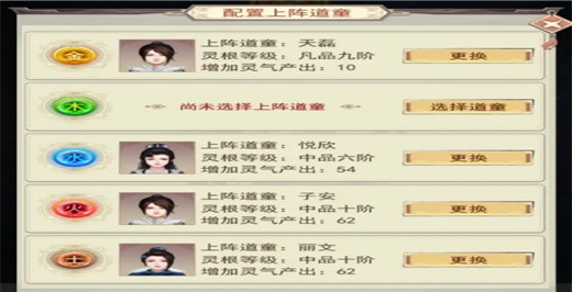 此处的道童依旧是会有五种不同的属性,也就是以常见的自然元素进行区分,其主要的效果也会各不相同。但其中有个是在填聚灵阵的阵法,这里道童的灵根等级越高,那么能够在提升的灵气值就会越多。