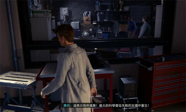 进入奥托博士(章鱼博士)的实验室,触发剧情后可自由探索。实验室内有照片、录音等值得关注的内容,同时可以看到博士和经费委员会的会议。