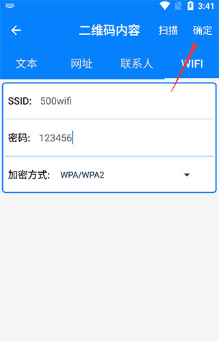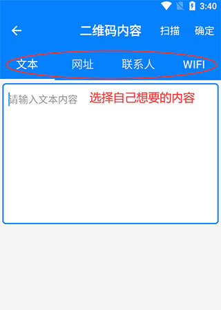 3、选择二维码传递的内容类型,如文本、网址、联系人、WiFi等;