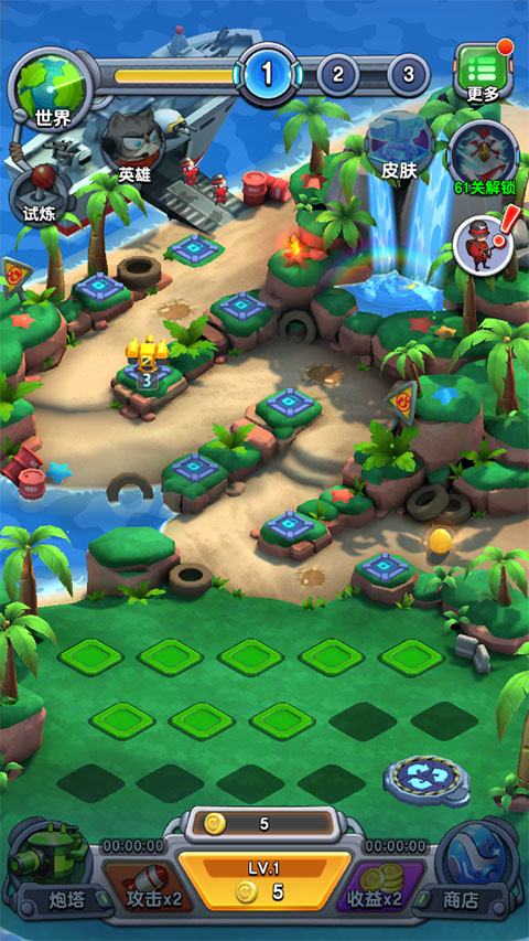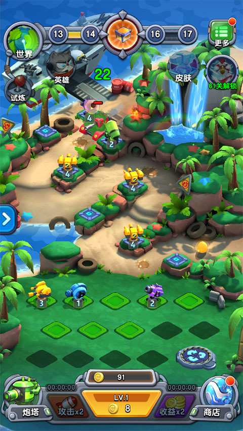 8、逐一解锁别具特色的地图场景(海岛、森林、沙漠等),每一个主题都包涵多个独具特色的战场)立足超强科技系统,倍增你在战斗中的力量。