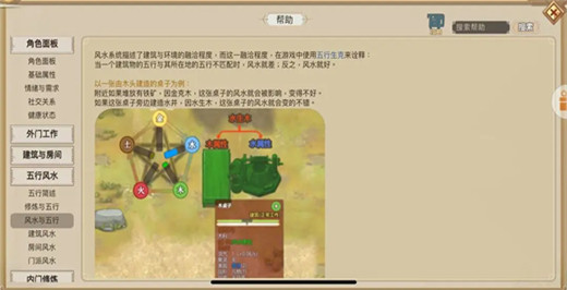 游戏的独特之处在于其精巧的“风水”系统,它基于五行相生相克原理设计。例如,金克木,如果你在铁矿旁边建造木桌,桌子的风水会受影响。房间布局也需考虑风水方位。