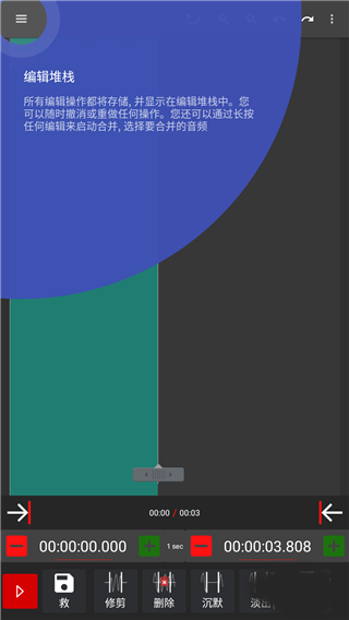 以音频剪辑为例,选择并打开一段待处理的音频文件(或现场录制)。在音频视图中,用户可以对音频长度进行剪辑,最长支持到100毫秒。