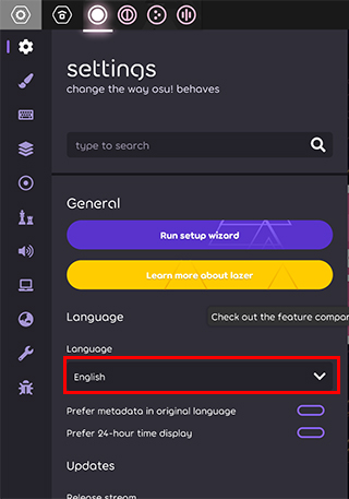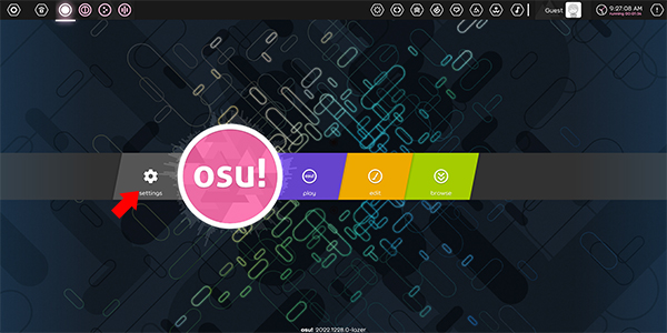 首先,在本网站下载并安装osu,完成初次启动时的基本设定。之后,您将进入游戏主页,在OSU!按钮的左侧点击Settings。