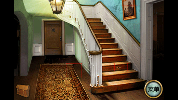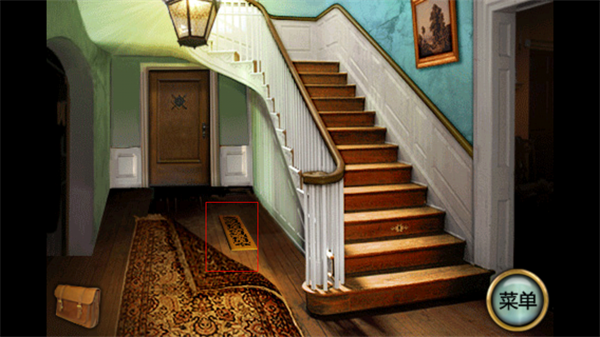 2、进入庄园大厅后,你会看到一个有楼梯的房间,注意地毯、楼梯墙上的壁画、楼梯上的锁孔以及正面的门。