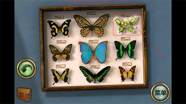 3、点击楼梯上层,进入二楼,这里有四扇门,首先进入右侧的第一间房,关注里面的存钱罐、壁上的蝴蝶标本和一幅画。