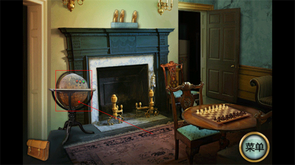 7、回到一楼,右侧房间是带壁炉的客厅,注意棋盘、地球仪、壁炉和壁炉上的鸟。