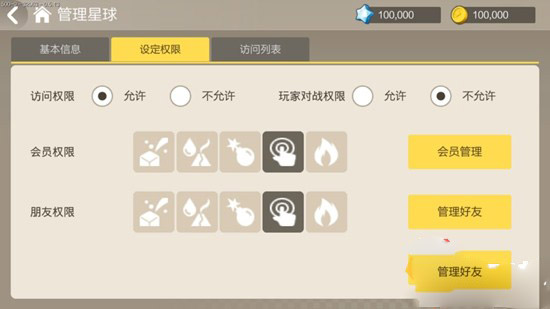 选择地形后,还可以自由更改星球的名称。完成设置后,可以选择是否邀请好友来访,以及是否允许互相伤害或破坏,确保您的家园安全。