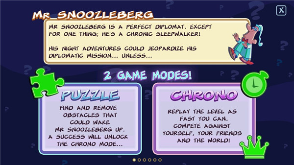 1、游戏画面简洁明了,一目了然地展示了游戏的基本内容。初学者会得到详尽的游戏引导,了解如何拯救梦游中的梦游先生。游戏中,身穿睡衣戴睡帽的梦游先生步步危机,玩家需要灵巧地操作以救助他。2、解谜探索的过程富有挑战性,随处可见的小机关激发玩家的神经,同时考验我们的想象力。