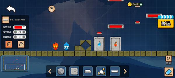 1、森林冰火人2正版两个角色需避免接触与自己颜色不同的液体。2、面对大面积液体时,利用机关或石块,使同色角色推动石块铺路,帮助另一角色通过。